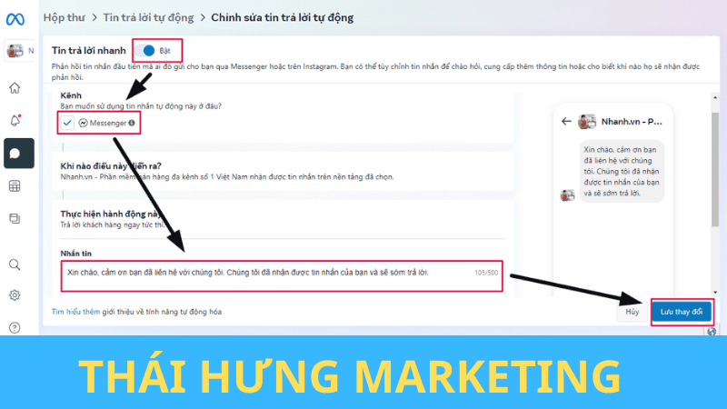 Thông qua bài viết này, Thái Hưng Marketing đã hướng dẫn chi tiết cách cài đặt tin nhắn tự động trên Messenger từ cơ bản đến nâng cao. Bằng cách áp dụng những kiến thức này, bạn có thể xây dựng một hệ thống phản hồi tự động hiệu quả, tiết kiệm thời gian và nâng cao trải nghiệm khách hàng. Hãy bắt đầu thiết lập tin nhắn tự động ngay hôm nay và khám phá những lợi ích mà nó mang lại cho doanh nghiệp của bạn!