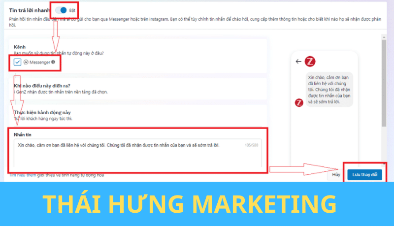 Nhập nội dung kiểu: “Xin chào [Tên khách hàng], cảm ơn bạn đã liên hệ! Chúng tôi sẽ phản hồi trong 5 phút.”