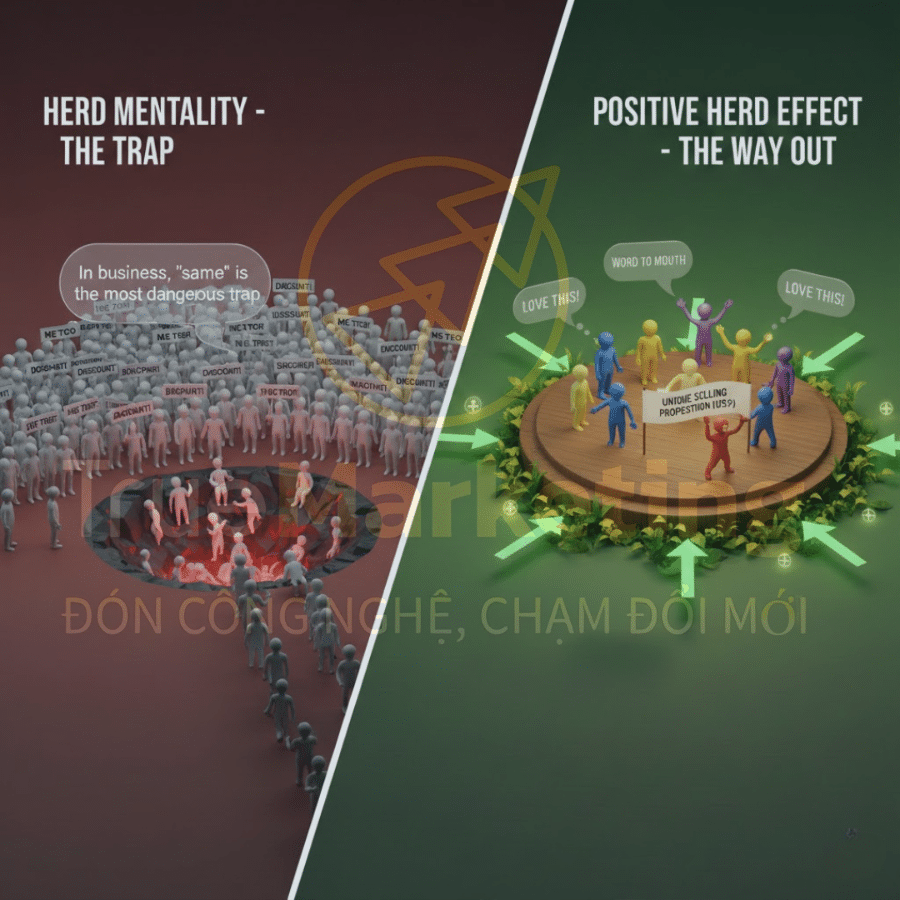 Hiệu ứng đám đông (Herd Mentality) trong kinh doanh xảy ra khi các chủ doanh nghiệp sao chép lẫn nhau một cách mù quáng—từ sản phẩm, chương trình khuyến mãi đến cách viết nội dung quảng cáo. Kết quả là thị trường tràn ngập các bản sao nhạt nhòa.