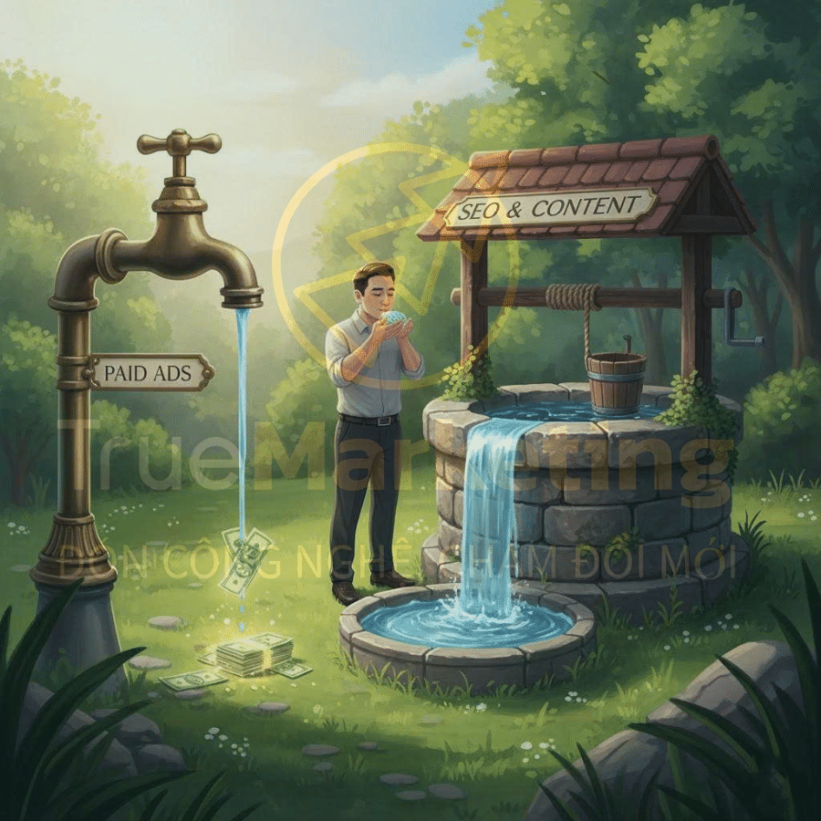 Quảng cáo trả phí giống như vòi nước, tắt tiền là tắt nước. Ngược lại, SEO và Content Marketing là việc đào giếng – tốn công ban đầu nhưng cung cấp nước (khách hàng) bền vững. Hãy đầu tư vào bài viết chuẩn SEO, video hướng dẫn giá trị để tạo “dòng chảy khách hàng tự nhiên” miễn phí từ Google và mạng xã hội.