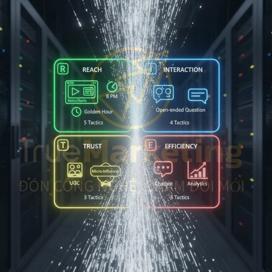Các thuật toán hiện đại (đặc biệt là TikTok và Facebook Reels) ưu tiên “Thời gian lưu lại trên nội dung” (Dwell time) và “Tương tác có ý nghĩa”. Framework RITE được thiết kế để thỏa mãn chính xác các yếu tố này, giúp trả lời câu hỏi sử dụng mạng xã hội tăng cường hiệu quả marketing như thế nào một cách khoa học nhất.