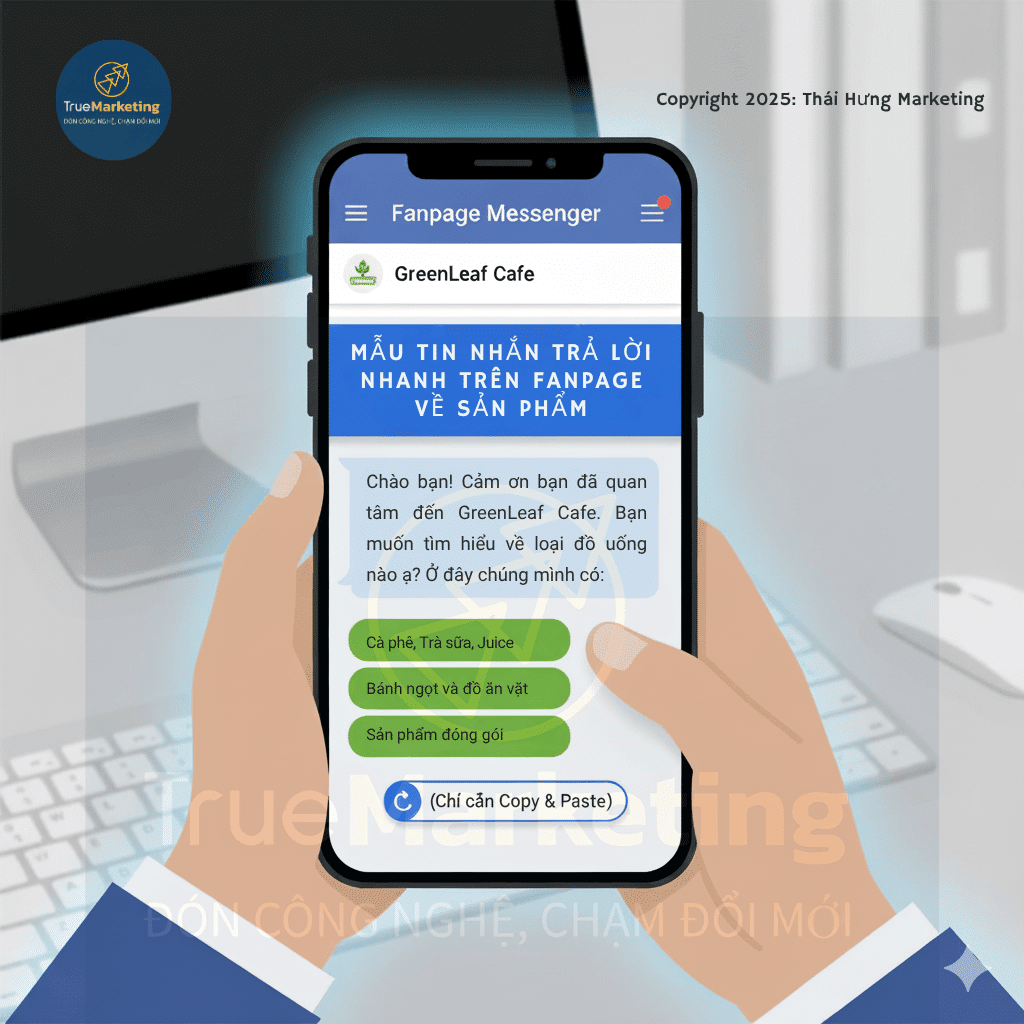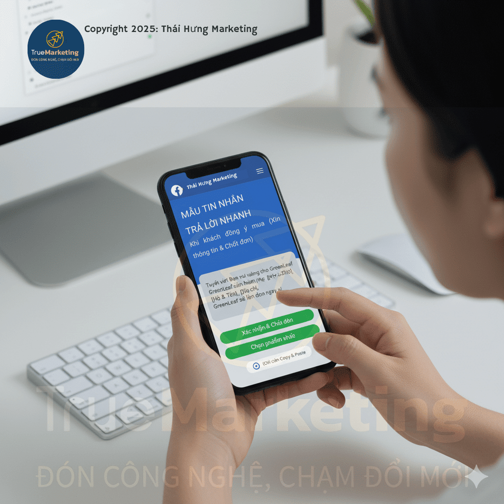 Đừng lãng phí thời gian soạn lại những câu đã có công thức hiệu quả. Hãy dành 15 phút ngay bây giờ để sao chép 10 – 15 mẫu tin nhắn trả lời nhanh chuyên nghiệp đã được Thái Hưng Marketing soạn sẵn. Sau đó bạn chỉ cần tinh chỉnh lại giọng điệu, một ít nội dung cho phù hợp với doanh nghiệp của bạn. Vậy là bạn đã hoàn thành thiết lập bộ kịch bản trả lời nhanh cho Fanpage.
